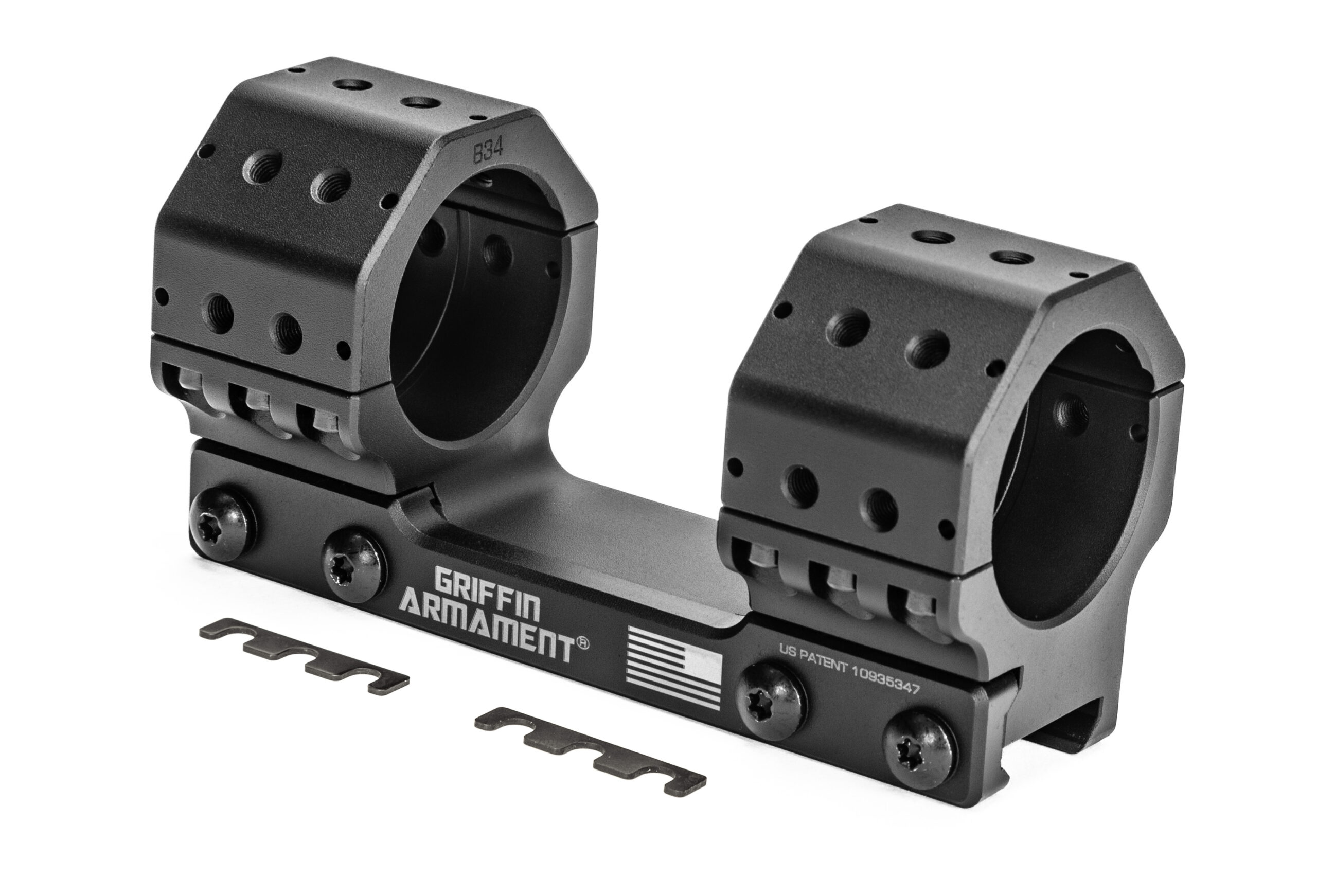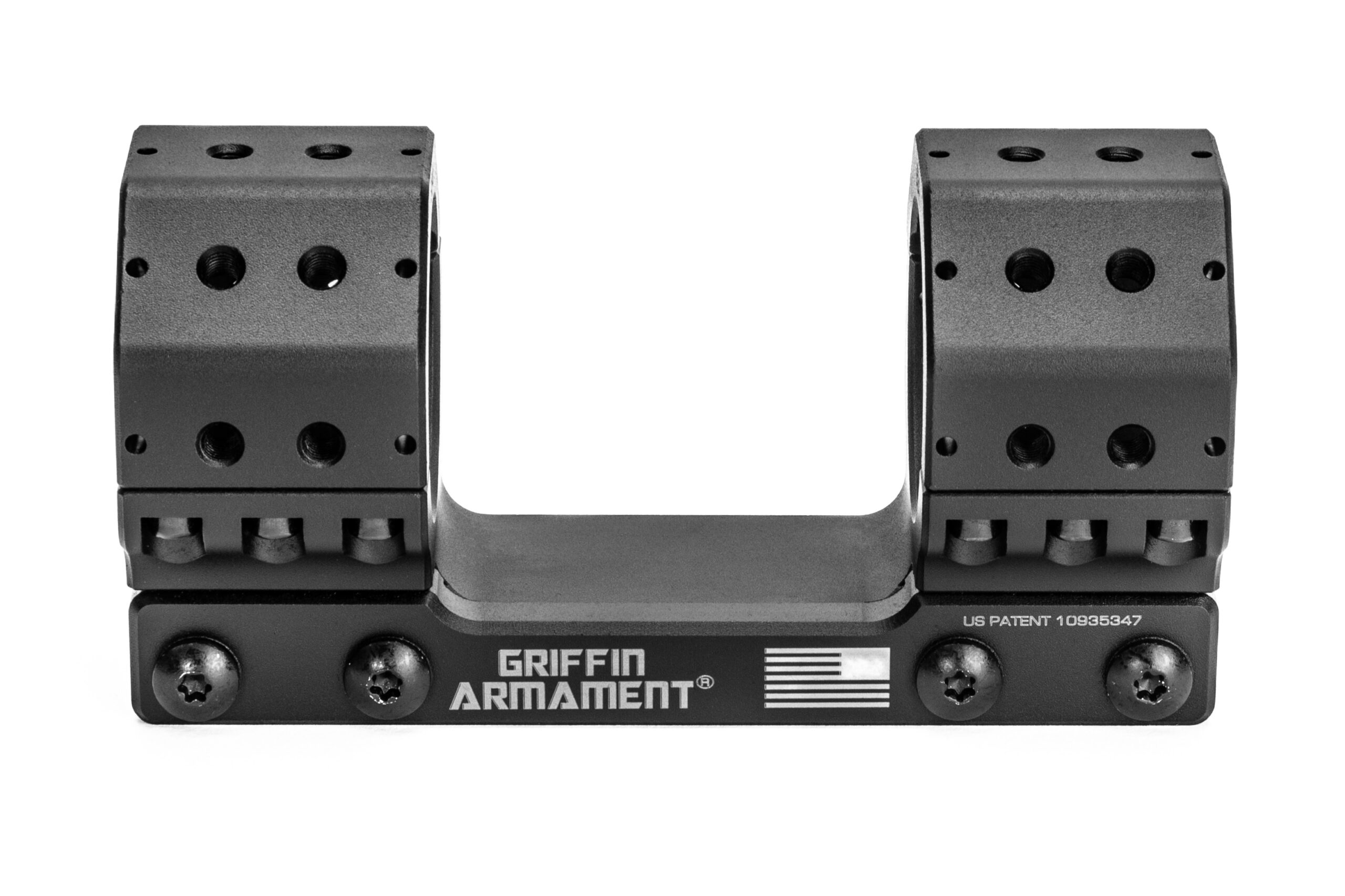 Griffin Precision Mounts™ (GPM™) are machined in-house in Watertown, WI from lightweight aircraft-grade 6061-T6 aluminum. GPM™ mounts incorporate a dowel pin alignment system allowing use of the Accessory Interface Suite (AIS™) of products, affording ambidextrous modular accessory support. The unique patented design splits the rings on two parallel but offset planes allowing accessories to be mounted on five AIS™ mounting surfaces: top, left, right, and 45° left & right offsets affording unsurpassed, ambidextrous flexibility.