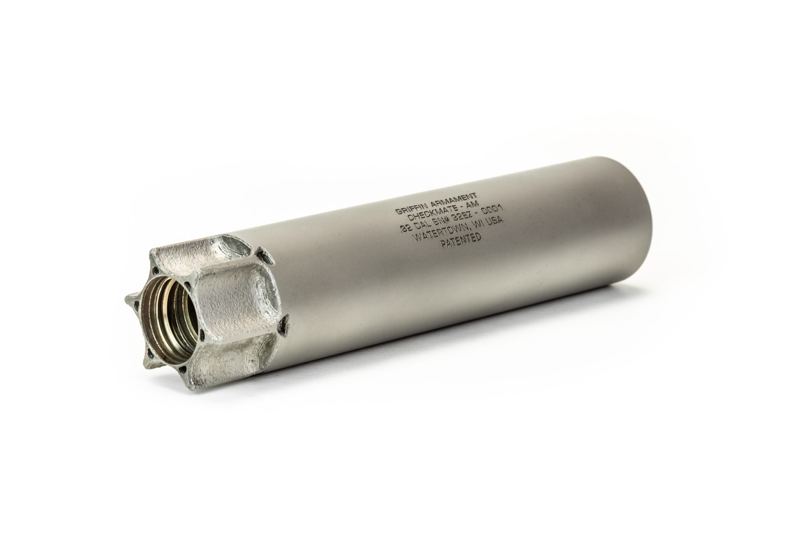The CHECKMATE-AM32™ Silencer is a heavy duty .32ACP suppressor constructed from Griffin’s proprietary Nickel 625X powder alloy utilizing state-of-the-art DMLS additive manufacturing technology. This model was optimized for use with .32ACP cartridges, but can effectively suppress undersized calibers as well. This is the silencer James Bond wished he had.