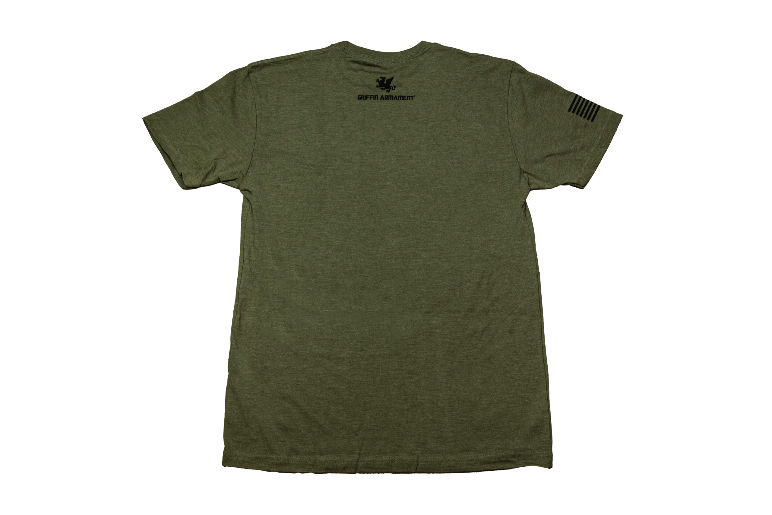Military themed Griffin brand shirt. Perfect for grillin, drinkin, range day, the gym…. shit we wear these all the time. The Company favorite. Premium Polyblend OD Green shirt, because we love quality.