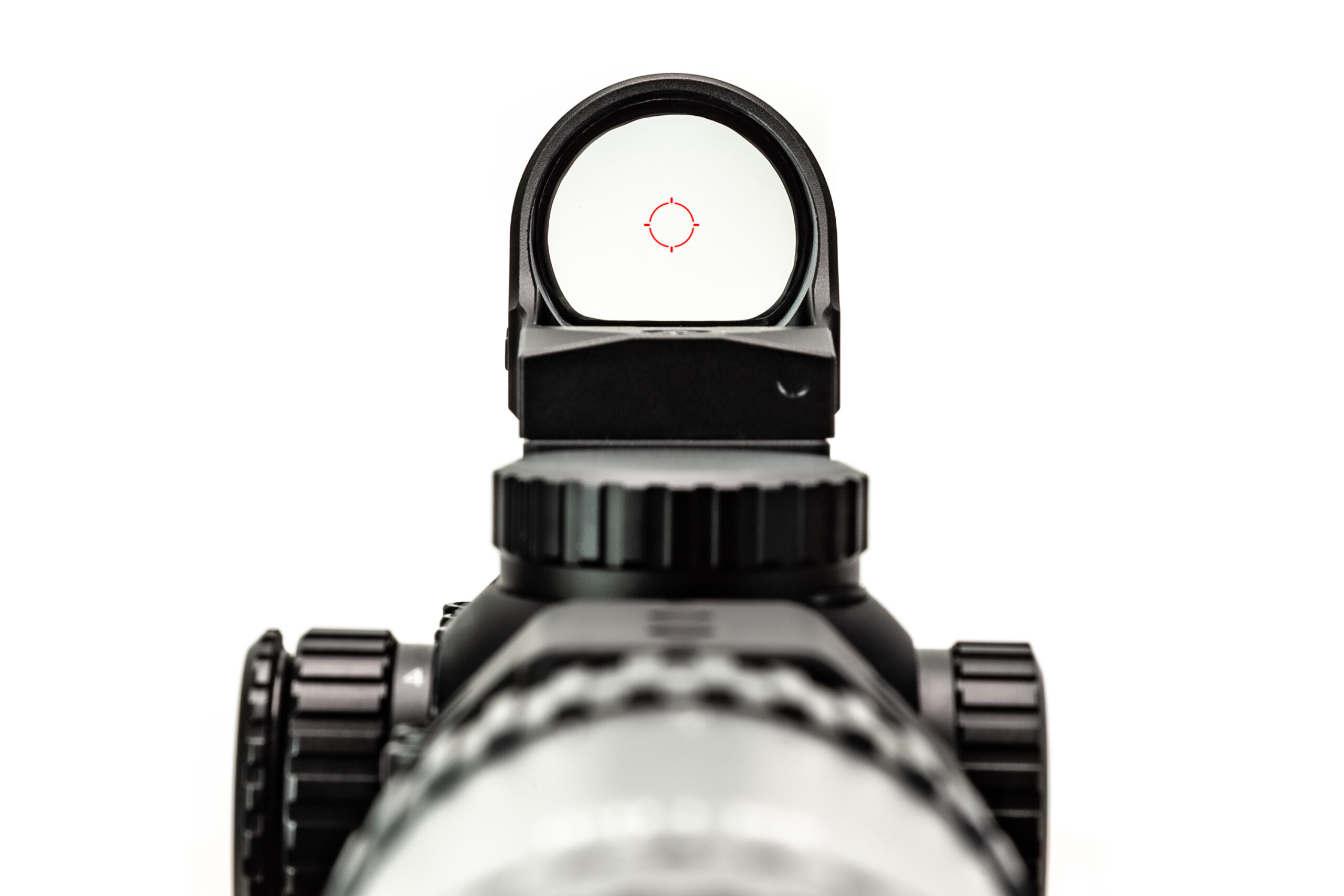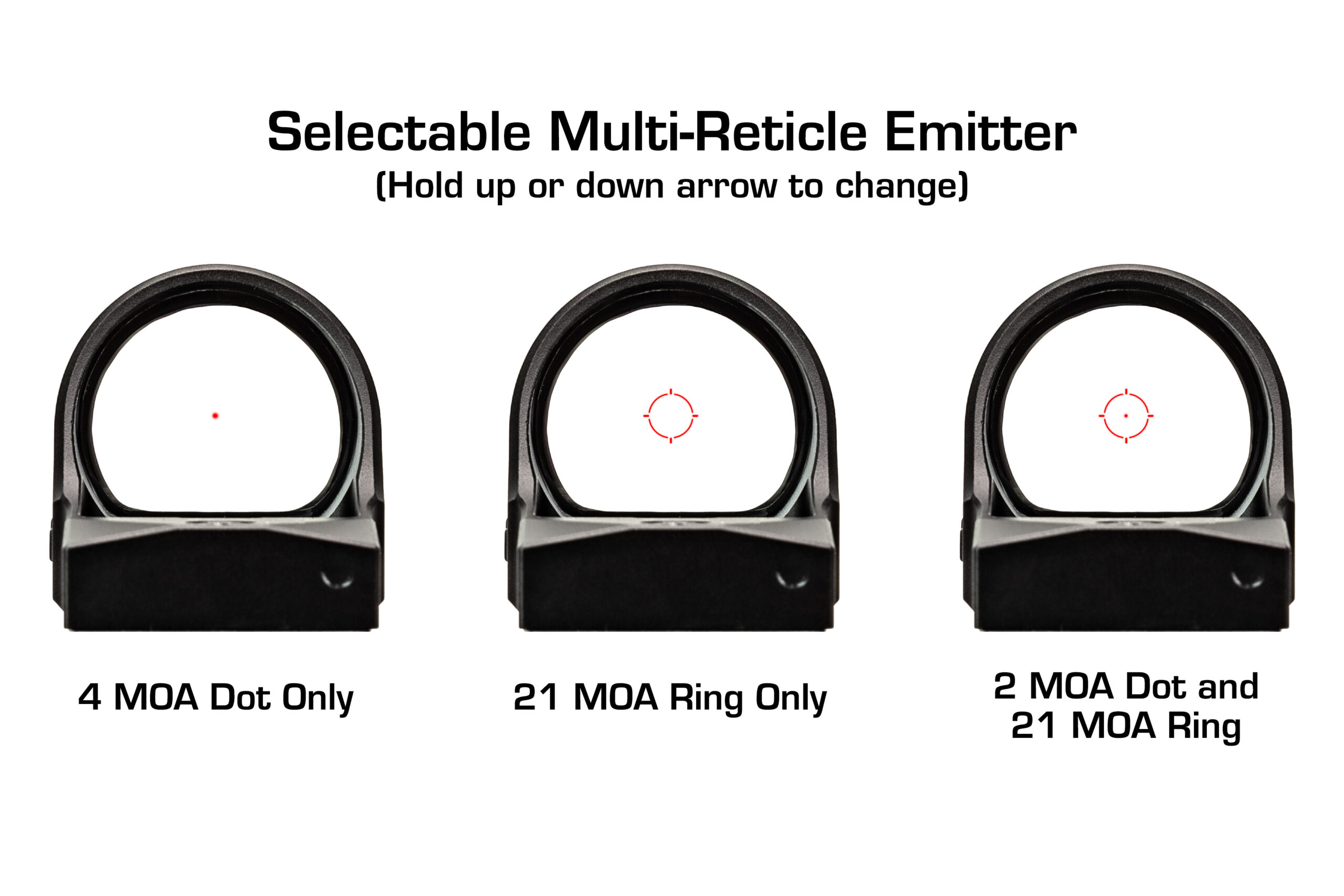 This optic features a round viewing window with crystal-clear, minimal parallax glass. The reticle comes with 10 brightness settings (2 NV, 8 Daytime) and a selectable reticle – offering a plain 4 MOA dot, a 21 MOA ring, or a combo 21 MOA ring with 2 MOA dot. The selectable reticle allows for an uncluttered sight picture with just the dot, or faster target acquisition with the ring setting enabled. Hold the up arrow to change reticle type, hold the down arrow to power off the optic.