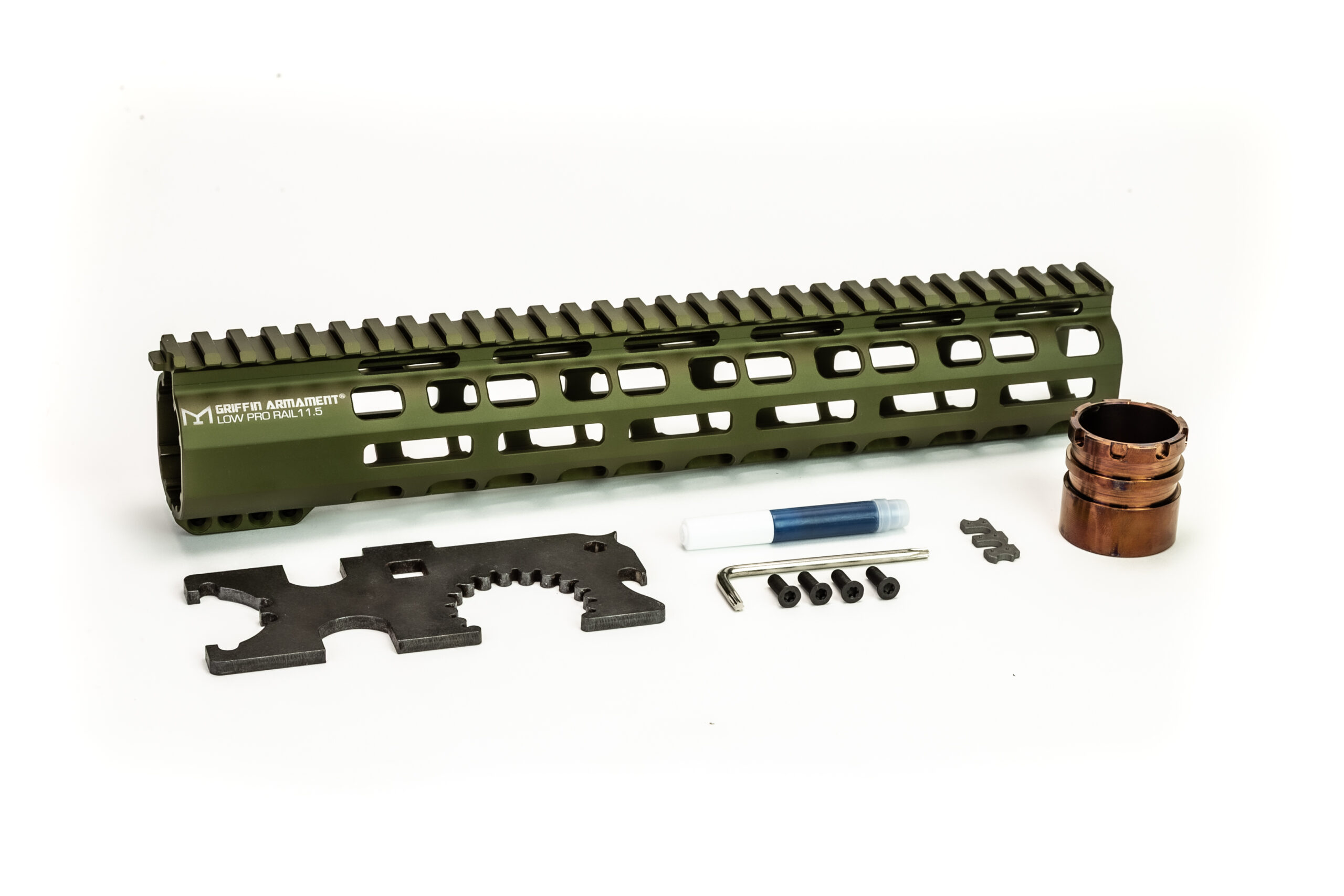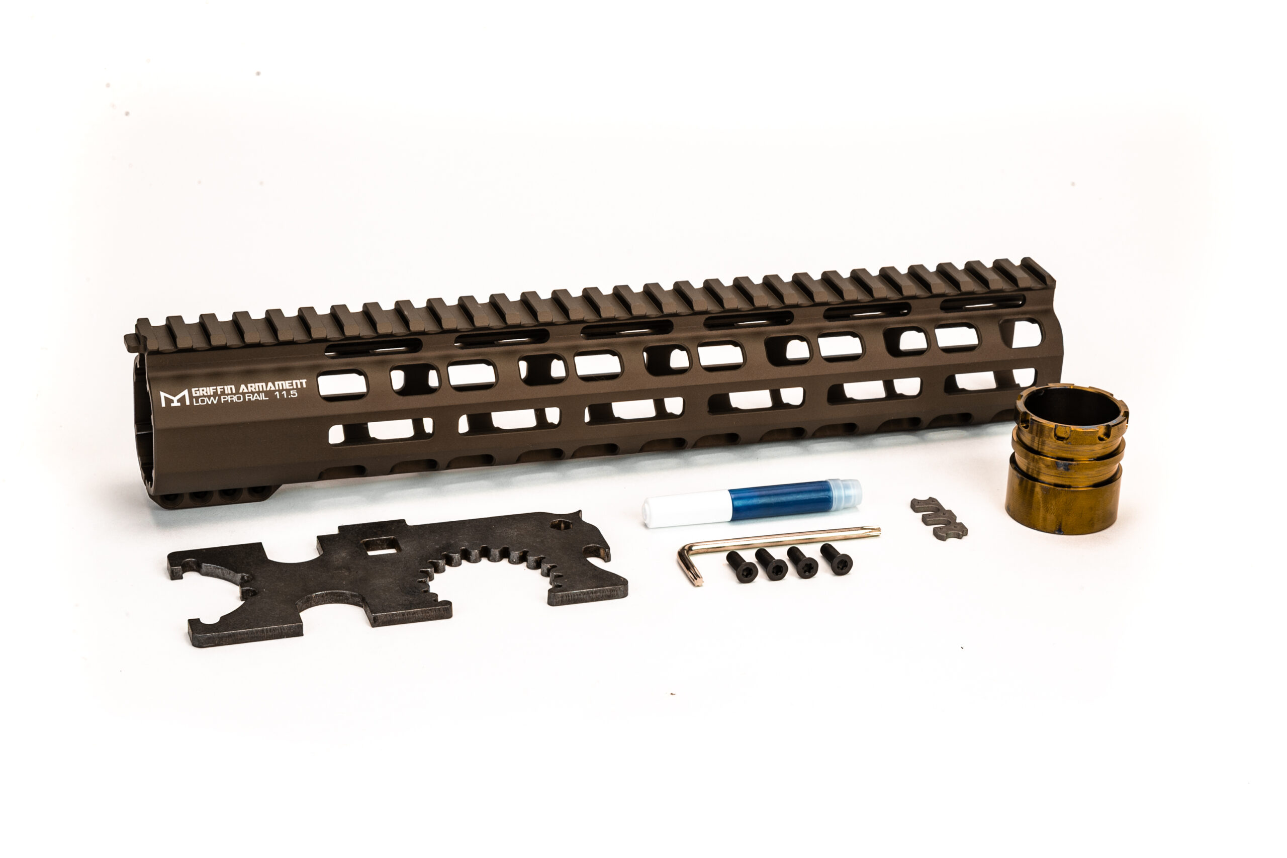 The Low-Pro rail features a close tolerance, heavy-duty, 17-4 stainless steel H900 heat treated barrel nut, which can be installed with the included Griffin GI Armorers Wrench. The rail is very user friendly to install. The slip fitted clamp design doesn’t requiring any special timing methods. The clamp boss in the rear section of the rail is low profile and ergonomically pleasing for relaxed posture carry at static positions. Flat head T15 torx screws should be tightened to 25/in pounds. The barrel nut should be tightened to ~55ft/lbs.
