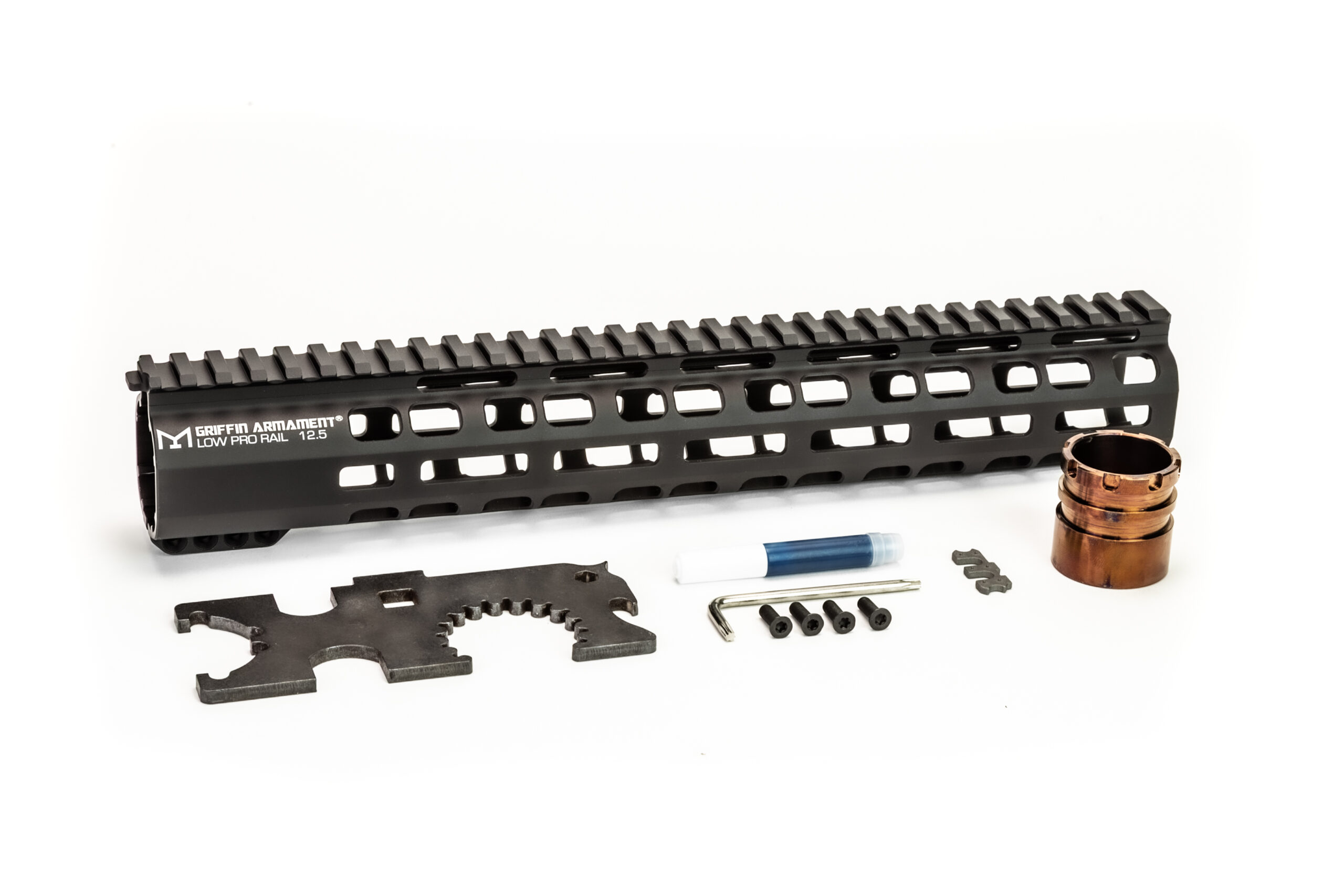 The Low-Pro rail features a close tolerance, heavy-duty, 17-4 stainless steel H900 heat treated barrel nut, which can be installed with the included Griffin GI Armorers Wrench. The rail is very user friendly to install. The slip fitted clamp design doesn’t requiring any special timing methods. The clamp boss in the rear section of the rail is low profile and ergonomically pleasing for relaxed posture carry at static positions. Flat head T15 torx screws should be tightened to 25/in pounds. The barrel nut should be tightened to ~55ft/lbs.
