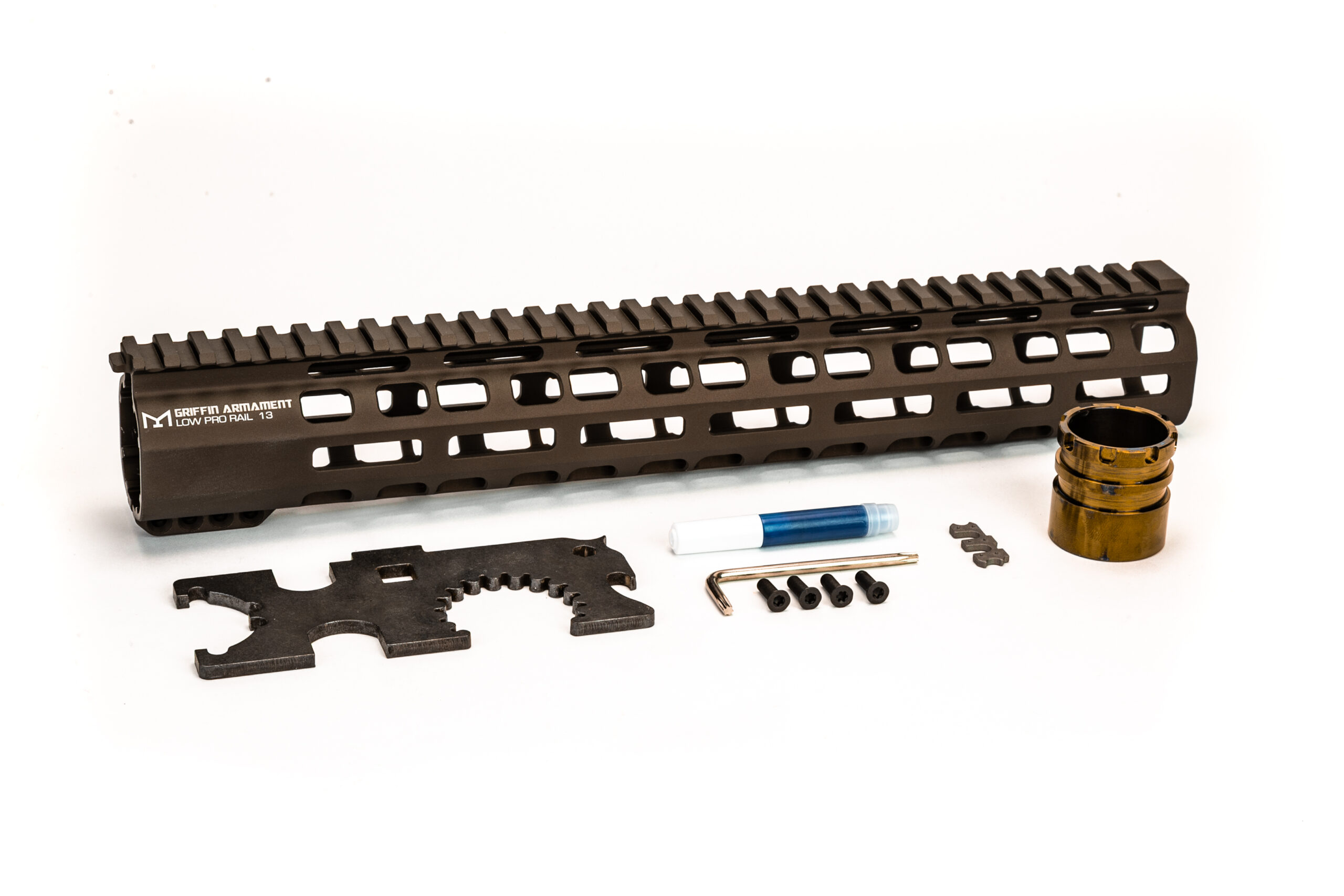 The Low-Pro rail features a close tolerance, heavy-duty, 17-4 stainless steel H900 heat treated barrel nut, which can be installed with the included Griffin GI Armorers Wrench. The rail is very user friendly to install. The slip fitted clamp design doesn’t requiring any special timing methods. The clamp boss in the rear section of the rail is low profile and ergonomically pleasing for relaxed posture carry at static positions. Flat head T15 torx screws should be tightened to 25/in pounds. The barrel nut should be tightened to ~55ft/lbs.