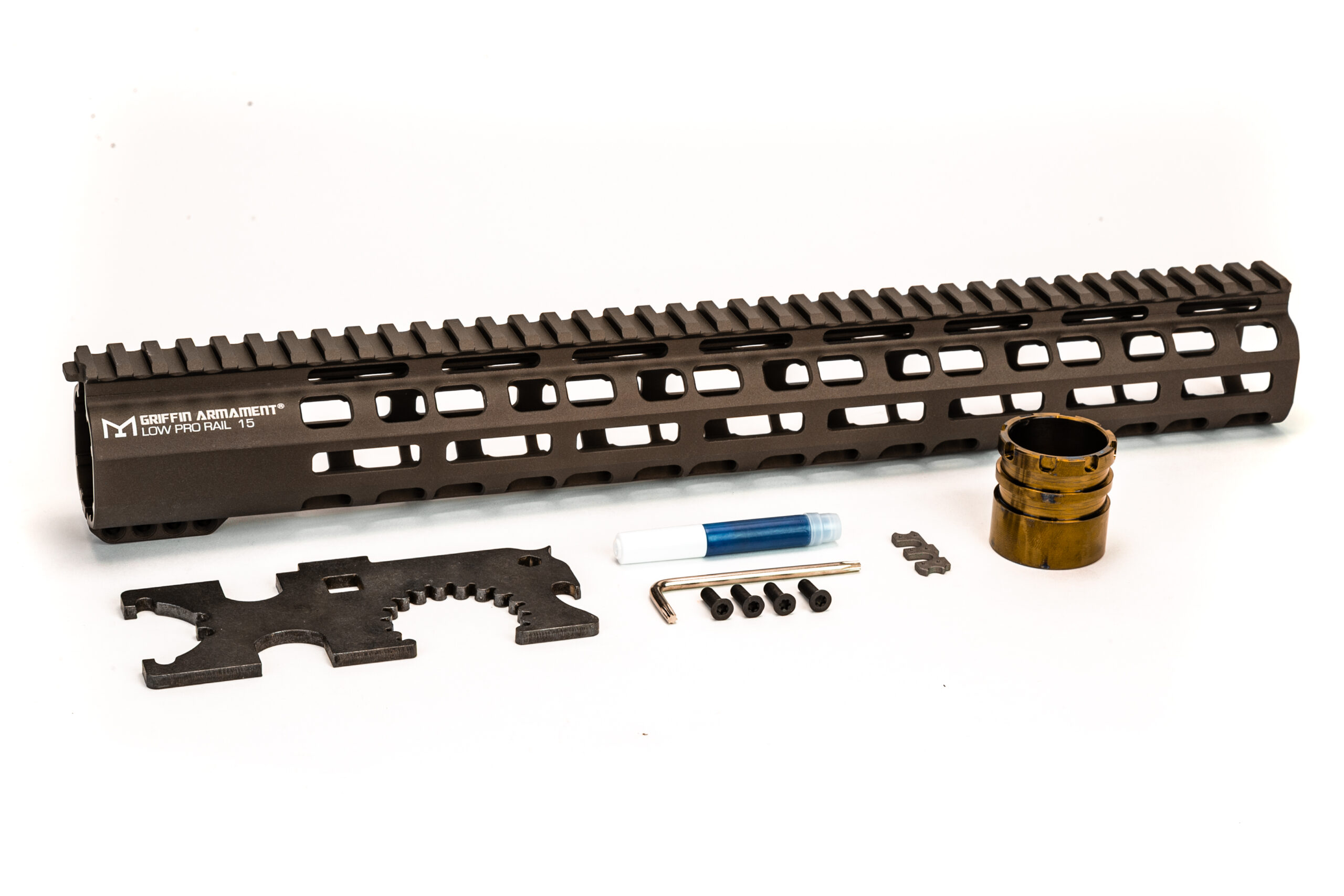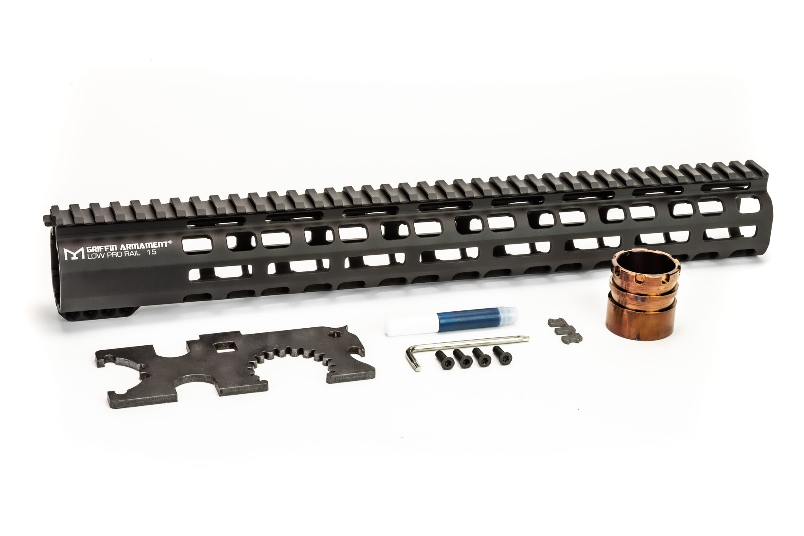 The Low-Pro rail features a close tolerance, heavy-duty, 17-4 stainless steel H900 heat treated barrel nut, which can be installed with the included Griffin GI Armorers Wrench. The rail is very user friendly to install. The slip fitted clamp design doesn’t requiring any special timing methods. The clamp boss in the rear section of the rail is low profile and ergonomically pleasing for relaxed posture carry at static positions. Flat head T15 torx screws should be tightened to 25/in pounds. The barrel nut should be tightened to ~55ft/lbs.
