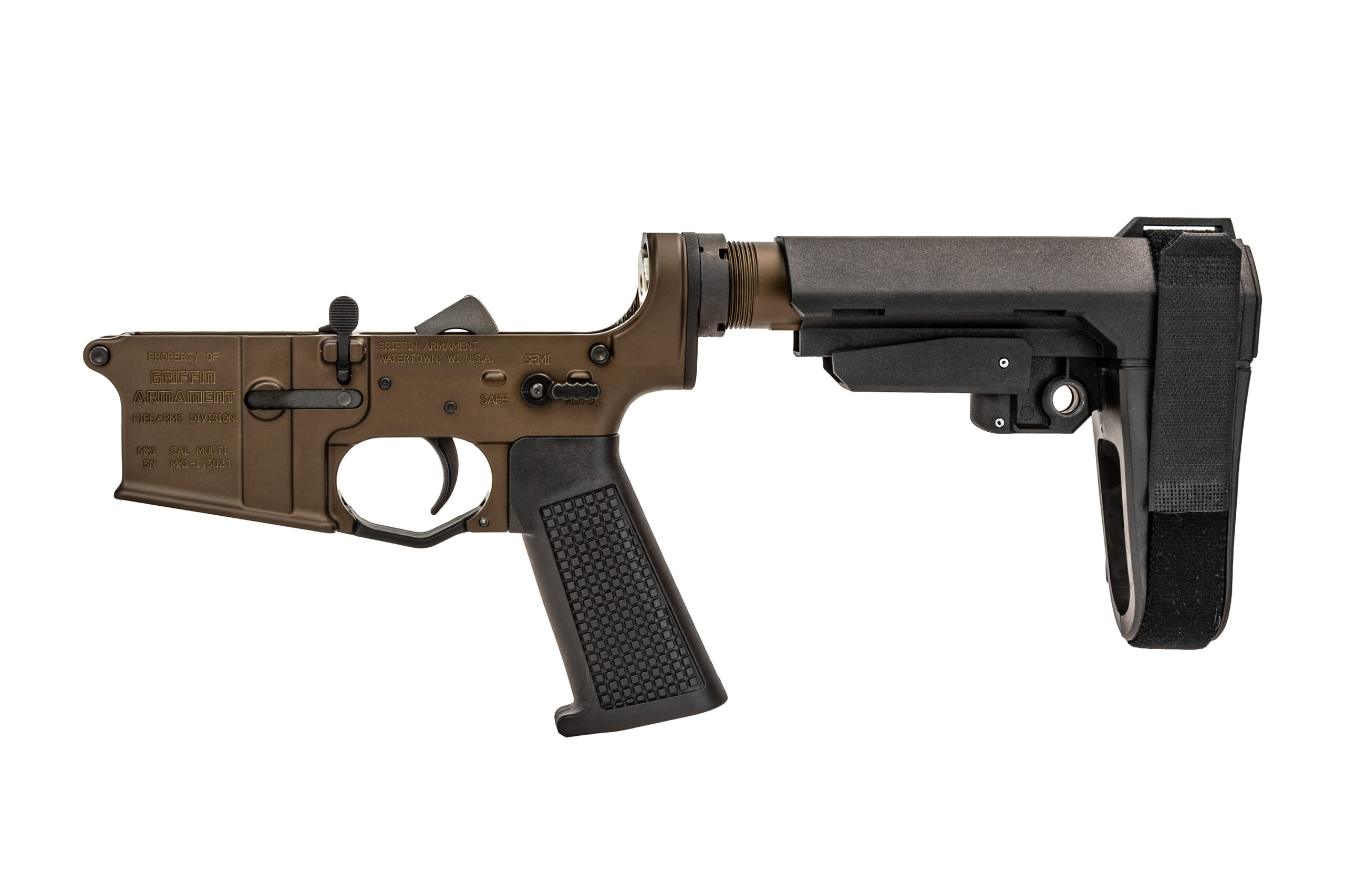 Included with this lower are all controls and user’s choice of trigger (Milspec or Griffin 2-Stage) can be chosen using the option buttons above. User’s choice of hand grip and pistol brace color can also be chosen using the buttons. Also included are Griffin’s dimpled takedown pins, Maritime Receiver Extension (MRE™), buffer spring, H2 buffer, and Contour Connect QD End Plate.