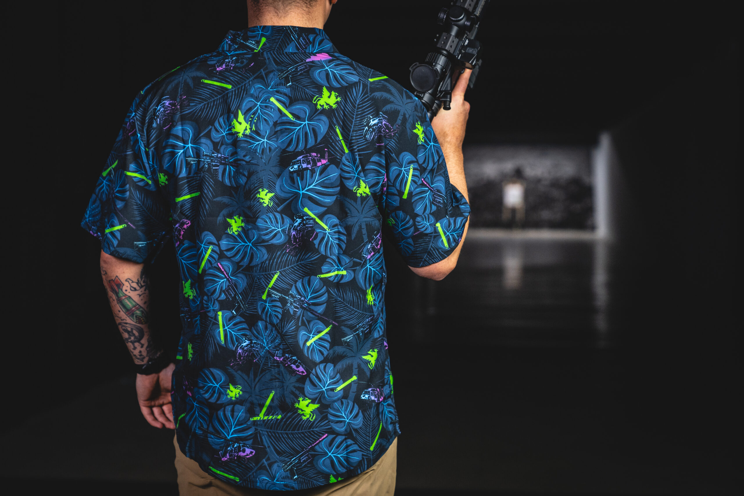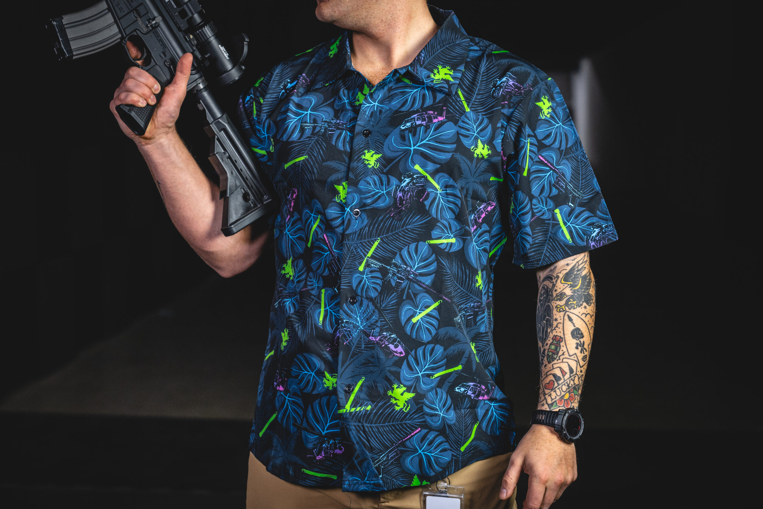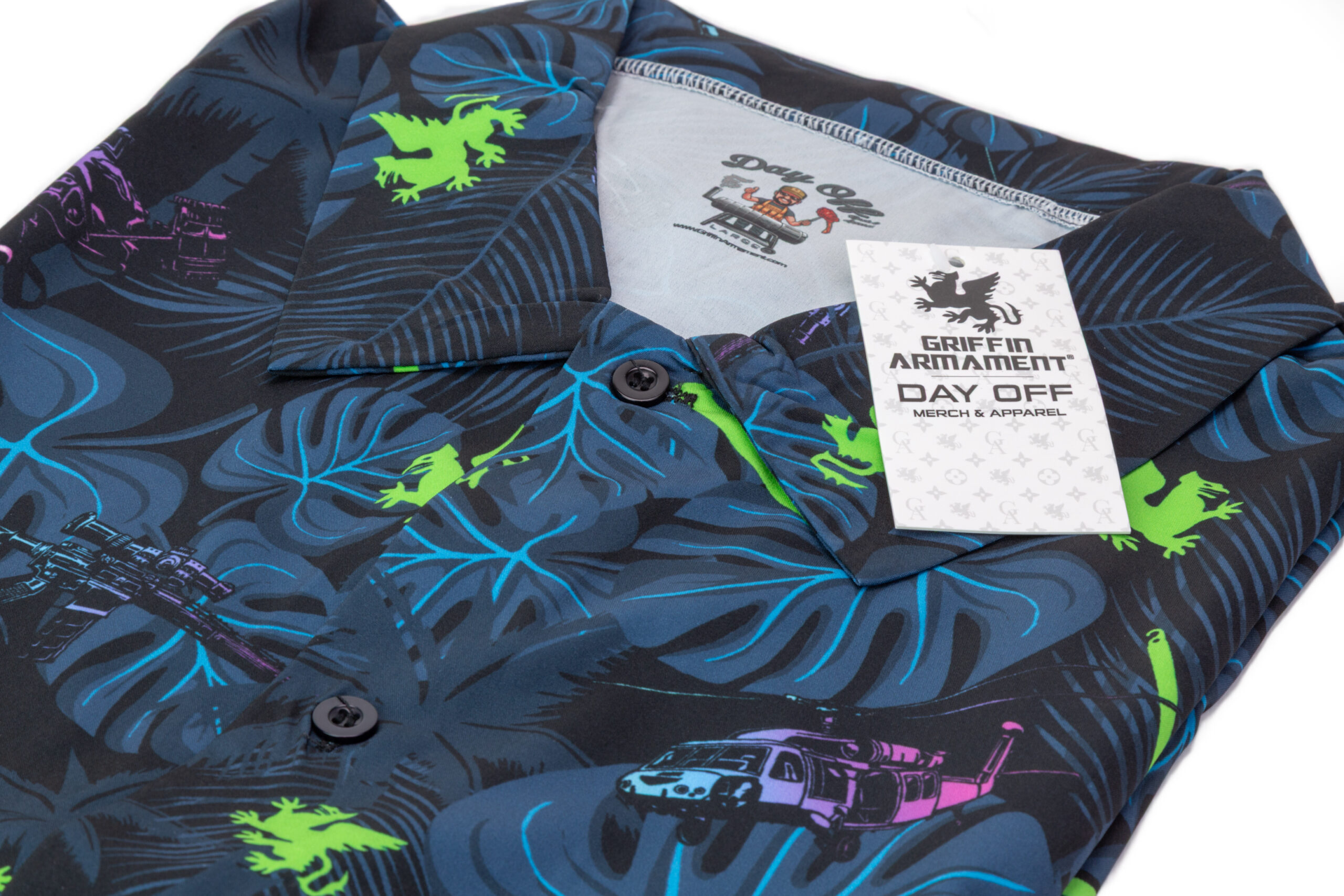 Griffin’s Day Off line of merch was designed to elevate your vacation wardrobe with comfortable attire and unique designs that are sure to turn heads. This Hawaiian shirt features a Tommy Bahama-inspired pattern with Blackhawks, MK2 rifles, NODs, and chem lights. Vibrant colors make this shirt stand out in a crowd while still being covert enough to slip under the radar.