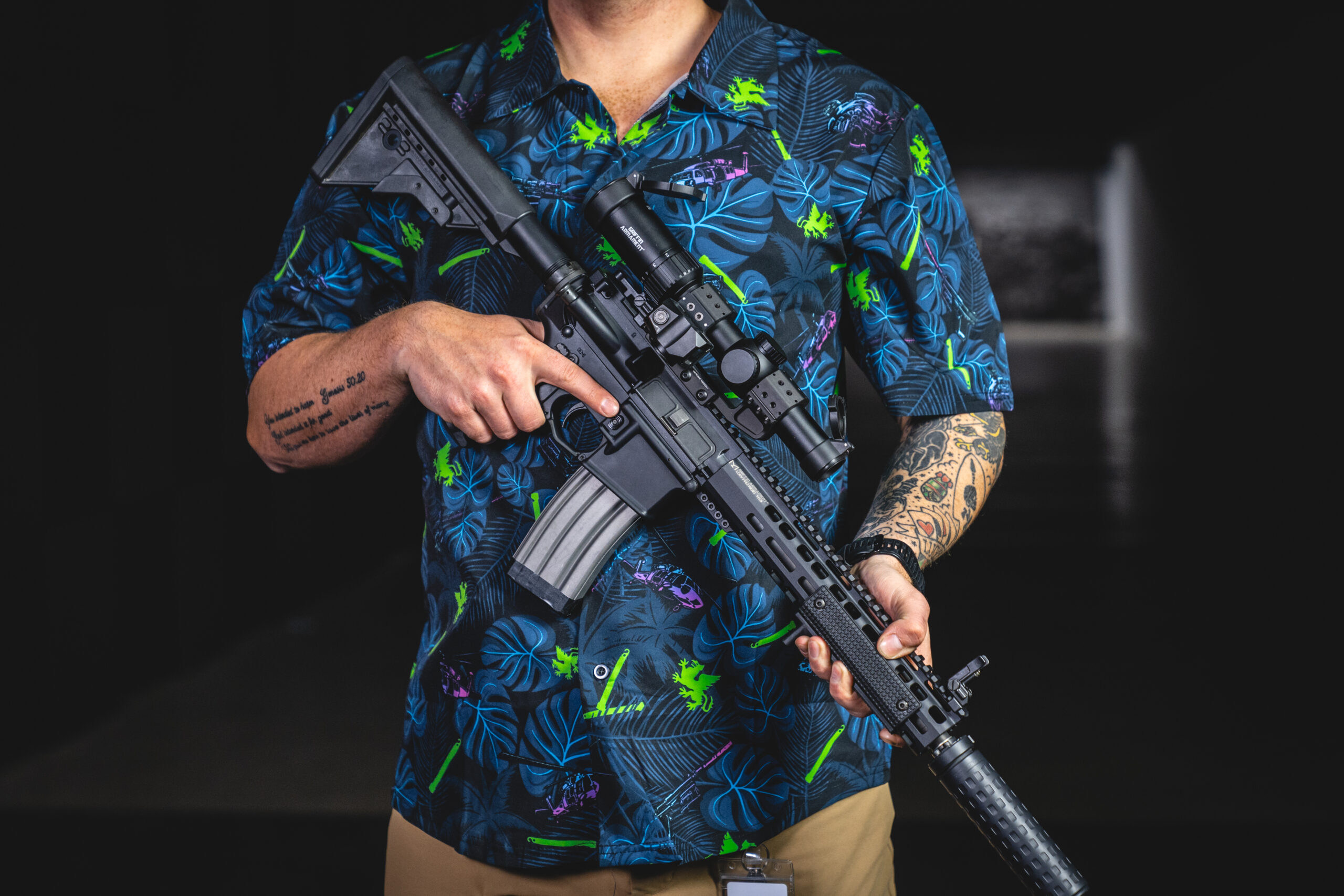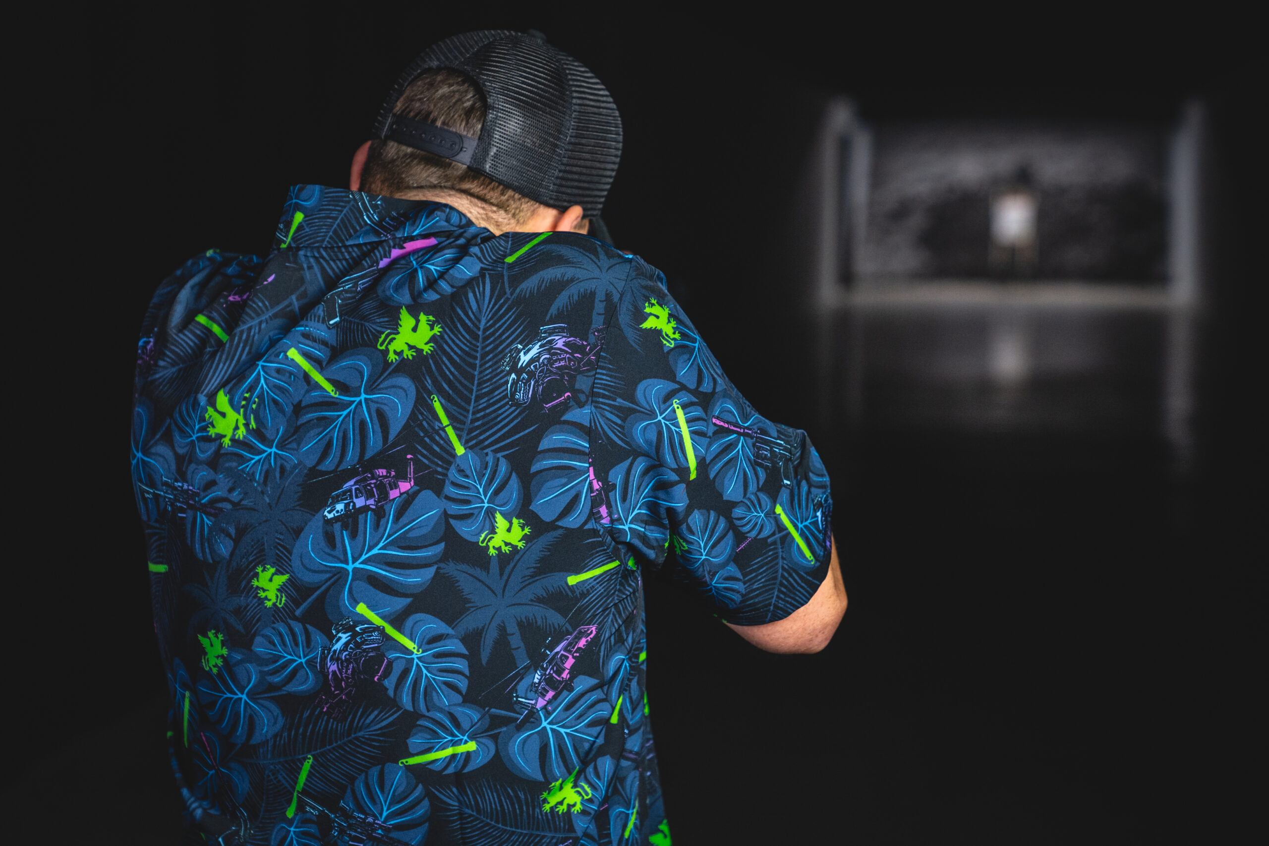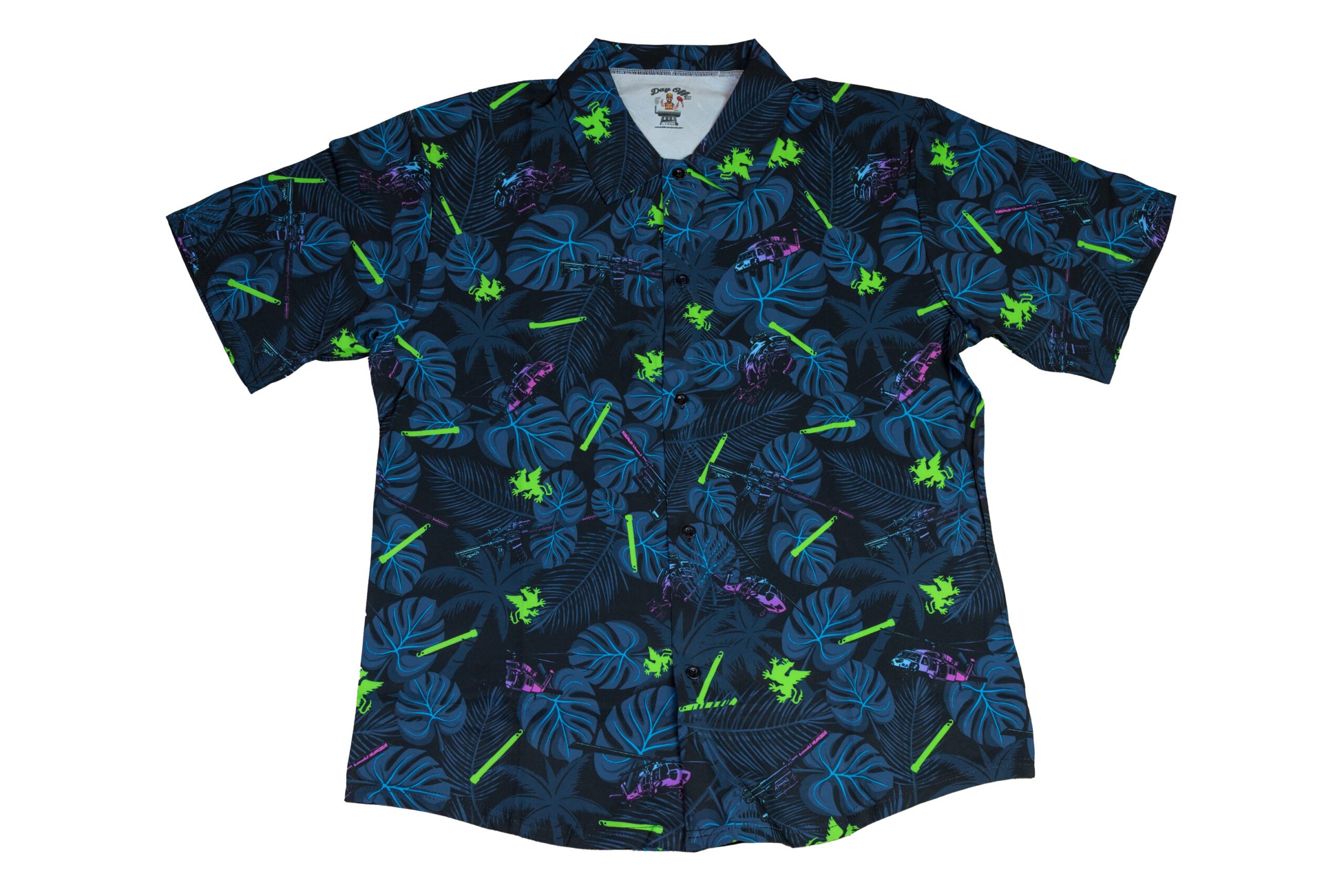 Griffin’s Day Off line of merch was designed to elevate your vacation wardrobe with comfortable attire and unique designs that are sure to turn heads. This Hawaiian shirt features a Tommy Bahama-inspired pattern with Blackhawks, MK2 rifles, NODs, and chem lights. Vibrant colors make this shirt stand out in a crowd while still being covert enough to slip under the radar.