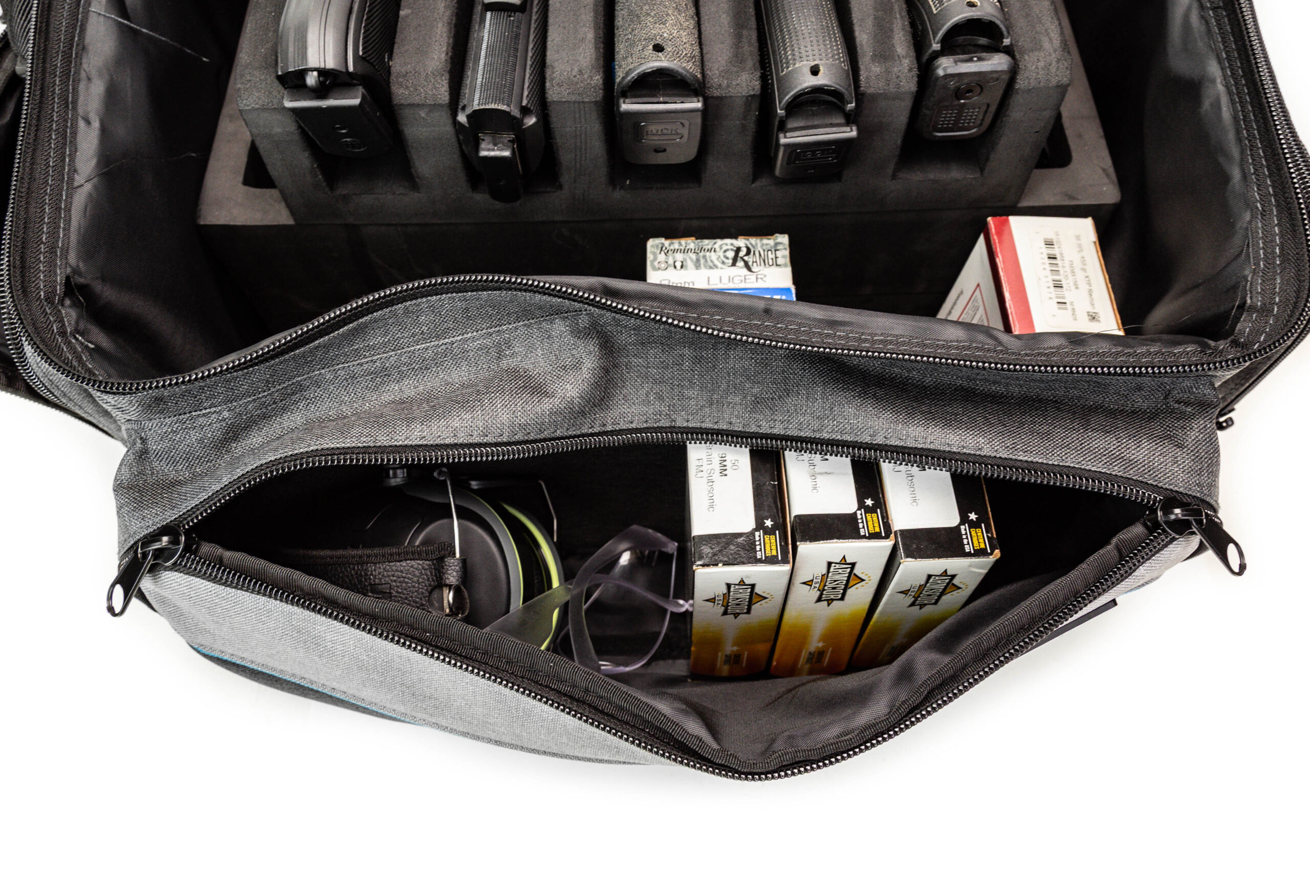 The Pistol Range Bag includes a 5-slot foam pistol divider with 6 Glock-style magazine slots for holding extra mags neatly. The pistol slots are sized to securely hold the firearm with enough headroom to accommodate pistols equipped with powered optics, lasers, or lights. The foam insert is slightly undersized to allow extra room for ammo boxes, ear/eye pro, tools, rags, etc.
