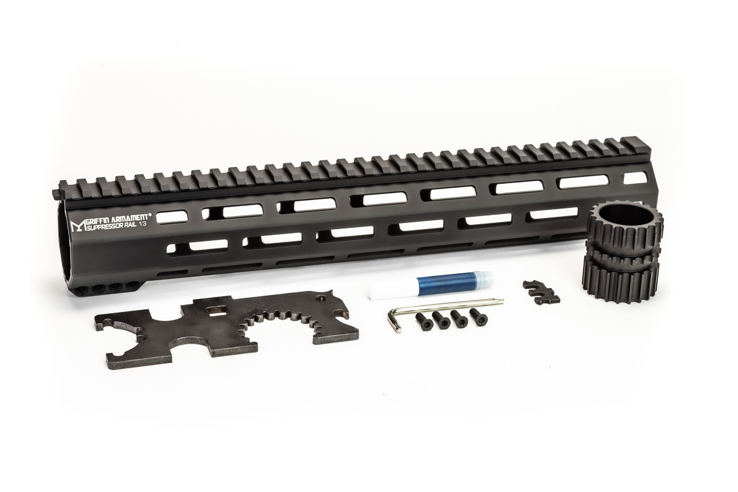 Griffin Armament® M-LOK compatible SR rails (Suppressor Ready) allow up to 1.5” outside diameter silencers to be mounted inside the octagonal M-LOK rail. This provides suppressor aficionados a sleek, and compact overall length to AR15 type firearms. This anti-rotation variant features a tab at the rear of the rail that locks into Griffin MK2 Upper Receivers to prevent unwanted rotation of the handguard under stress.