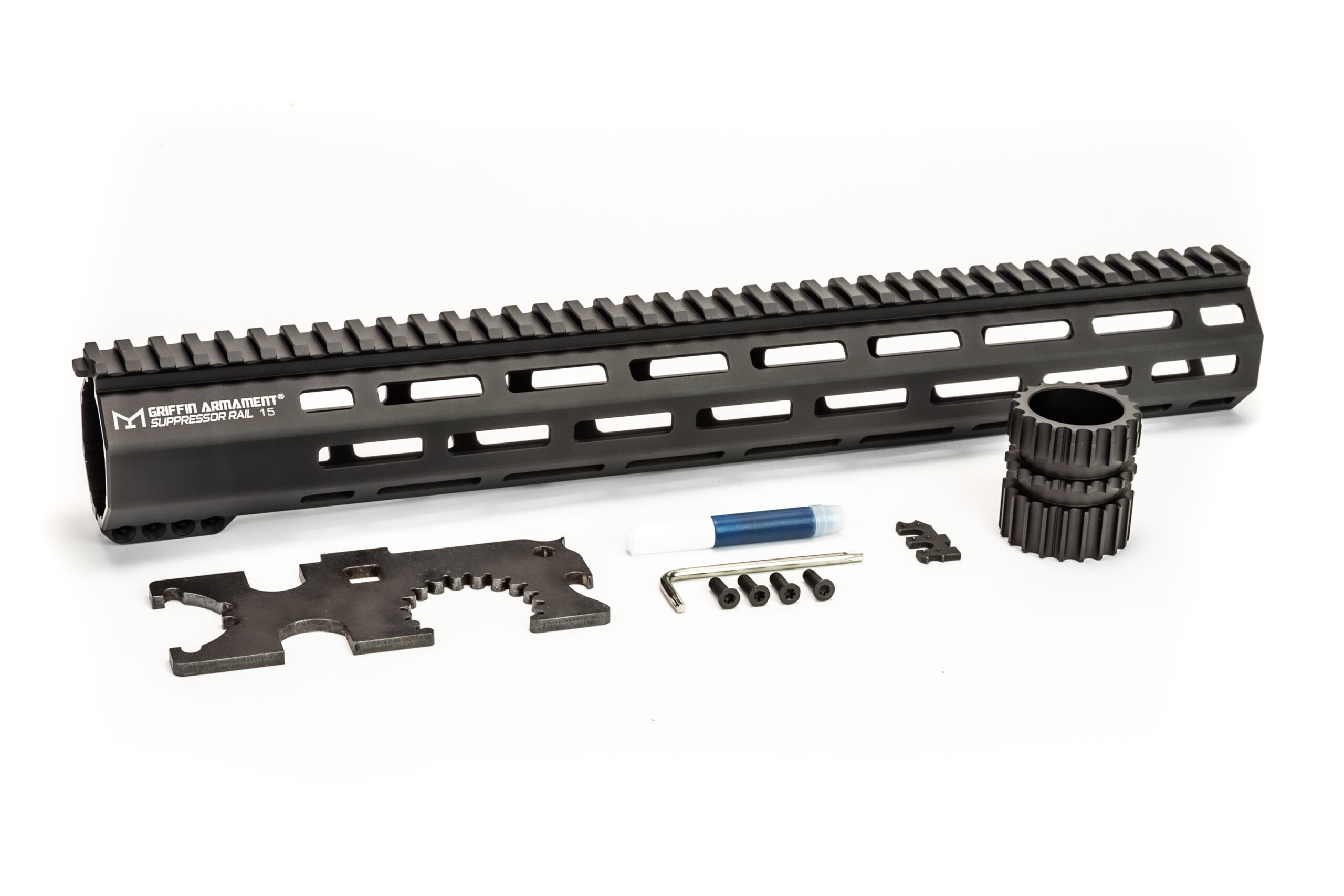 Griffin Armament® M-LOK compatible SR rails (Suppressor Ready) allow up to 1.5” outside diameter silencers to be mounted inside the octagonal M-LOK rail. This provides suppressor aficionados a sleek, and compact overall length to AR15 type firearms. This anti-rotation variant features a tab at the rear of the rail that locks into Griffin MK2 Upper Receivers to prevent unwanted rotation of the handguard under stress.